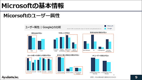 Googleと比較してBingの方が、年収が高く、意思決定者の割合が高い。また、学校で利用するPCにはEdgeが採用されていることが多いため、若年層のユーザーも多いという。