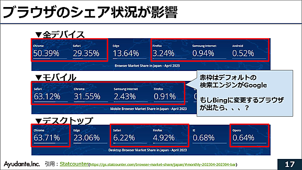 もしSafariの検索エンジンがGoogleからBingに替わったら、検索エンジンのシェアに大きな変動があると考えられます。現状はGoogle一強ですが、いつ終わるかわかりません。Bingを含め、他の検索エンジンと併せてブラウザの動向にも目を向けておく必要があります(宮下氏)