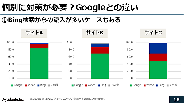 1つめは、「Bing検索からの流入が多いケースもある」ということだ。次図のように自然検索の参照元を調査したところ、サイトA、サイトBは、Google、Yahoo!からの検索が多いが、サイトCはBingからの流入が約3割となった。