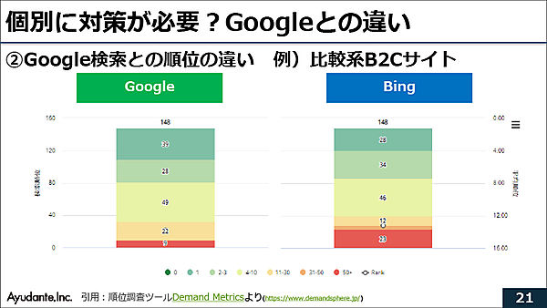 2つめは、「Google検索と順位が異なる」ことだ。順位調査ツール「Demand Metrics」を使って、ある比較系B2Cサイトの148キーワードの順位をGoogleとBingで比較したところ、Bingの方が圏外になるキーワード数が多かったという。