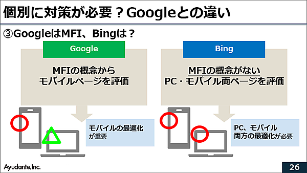 3つめは、「GoogleはMFI(Mobile First Index)、BingではモバイルとPC両方の最適化をはかる」ことが大切になる。SEOをやっている人であれば、モバイルページを評価対象とする、GoogleのMFIのことはご存知だろう。一方、BingはMFIの概念がなく、PC、モバイルの両方を評価するため、両方の最適化が必要だ。