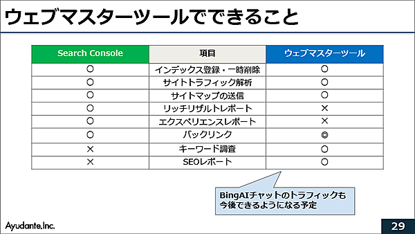 次の表は、ウェブマスターツールとサーチコンソールを比較したもの。インデックス登録、サイトトラフィック解析、サイトマップ送信など基本機能は両方にあるものの、Google独自指標のエクスペリエンスレポートなどは用意されていない。「ただし注目したいのは、バックリンク、キーワード調査、SEOレポートといったSEOツールの機能がウェブマスターツールにあることだ」と宮下氏は語る。