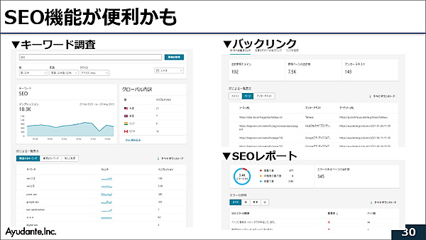 キーワード調査では、Bing検索でのキーワードのインプレッション数を国、言語、デバイス別に表示できるほか、関連用語のインプレッション数も表示される。バックリンクは、どの外部サイトからどのページにリンクがあるのか、アンカーテキストの内容まで確認できる。管理している自サイトだけでなく競合など他サイトの傾向も見られるので、競合調査に有効だ。SEOレポートでは、Bingがランキング指標にしている項目のうち、課題があるページを確認できるという。
