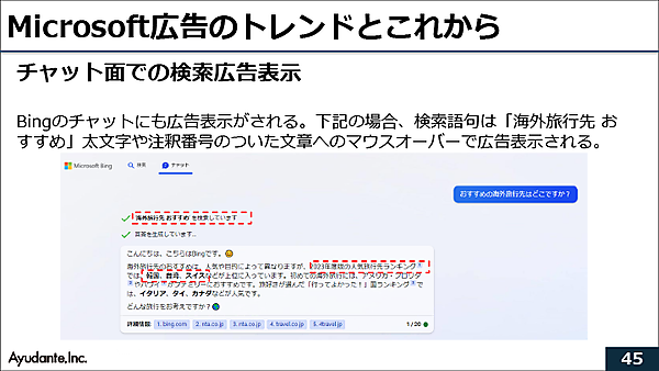 2つめは、Bingのチャット面にも広告が表示される仕様になったことだ。たとえば次図のように、チャットの内容に合わせ、太文字や注釈番号がついた文章にマウスオーバーすることで広告表示される。なかには、マッチするショッピング広告も表示される場合がある。