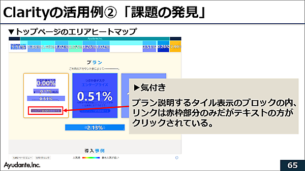 最後に、無料で使えるユーザー行動分析ツール「Microsoft Clarity」が紹介された。アユダンテでは、「仮説の検証」と「課題の発見」を目的に使用しているという。