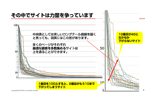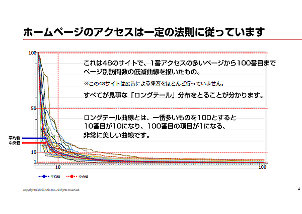上記の図は、48サイトの1番アクセスの多いページから100番目までページ別訪問数の低減曲線を描いた図だ。この48サイトは、広告による集客やSEO施策を積極的に行っていない。つまり、純粋なウェブのアクセスが取得できると考えたサイトをピックアップしている。48サイトはすべてがロングテール分布となっている。
