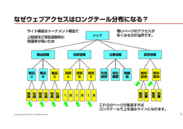 なぜサイトのアクセスは、必ずロングテール分布になるのだろうか。サイト構成はトップページからはじまるトーナメント構造で、上階層ページは下階層ページを束ねている存在だ。よって、上階層ほど等比級数的にアクセスされる確率が上がる。“本当にアクセスして欲しいページ”は、次の図で青に色付けされた上階層ページだろうか? 本当にアクセスしてほしいのは、緑色の矢印が指しているページではないだろうか。これらのページの閲覧数が増えれば、ロングテール曲線がなかなか下がらない「粘りのあるサイト」になれる。