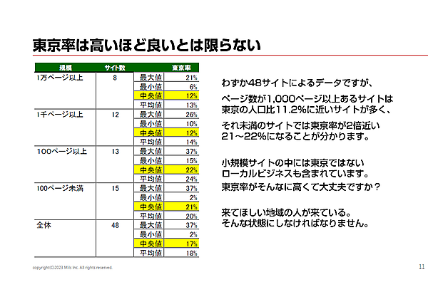 1万ページ以上・1千ページ以上のサイトの「東京率」の中央値は12%と、全国人口に占める東京の人口割合(「人口推計(2022年10月1日現在)」(総務省統計局))の11.2%に近くなっている。だが、それ未満の規模のサイトでは東京率が2倍近い、21~22%になることが分かった。小規模サイトにはローカルビジネスのサイトも含まれているが、東京率が高くなっている。「ぜひ自社のサイトを確認してください。来てほしい地域の人が来ている、これがウェブ運営の鉄則ですよ」と石井氏。