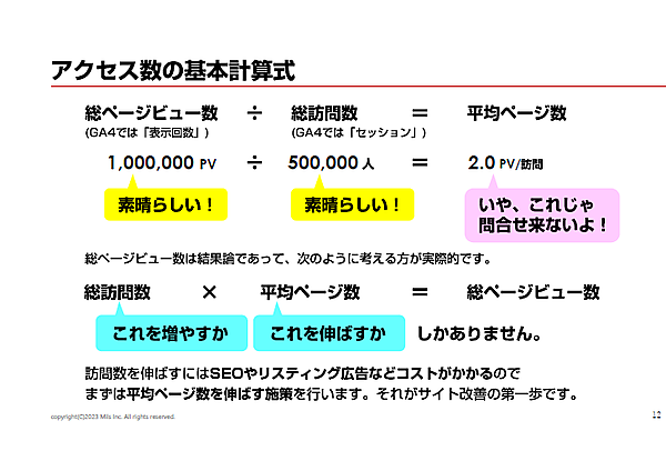 たとえば、100万ページビューのサイトで、50万の訪問がある場合、平均2ページしか見ていないことになる。石井氏は「総ページビュー数はあくまで結果論。『総訪問数』に『平均ページ数』を掛けたら『総ページビュー数』が算出される、と考えるほうが実際的」と語る。