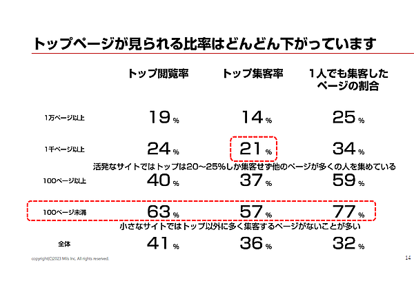 「トップページが見られる比率はどんどん下がっている」と石井氏。48サイトの調査では、大規模サイトほどトップページの閲覧率および集客率(トップページから流入した割合)は小さくなることが分かった。小さなサイトではトップページの閲覧率と集客率の割合が高く、トップ以外で集客できるページが少ない。