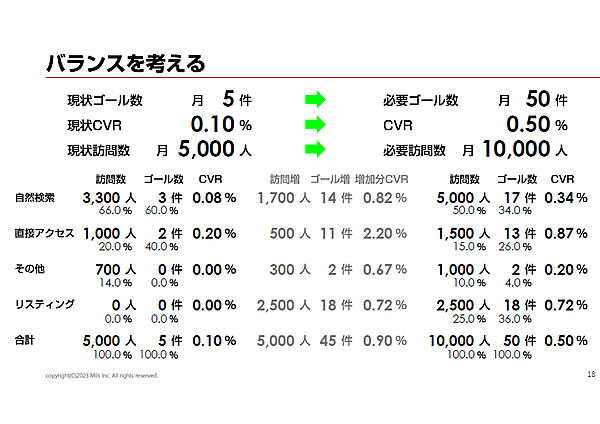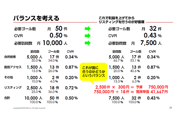 バランスを考える例として、石井氏は月50件の問い合わせは難しいという場合、中間目標として必要訪問数を7,500で考えたプランを紹介した。