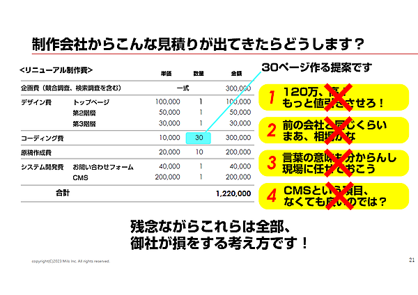 高いと感じて値引きをする、前の会社と比較して相場だと思う、言葉の意味も分からないし現場に任せておこうと思う、高い項目を削ろうとする……。石井氏は「この考え方はいずれも損をする」と語る。「ホームページは儲かるようにつくりましょう」と、石井氏は見積りの判断ポイントを解説していった。