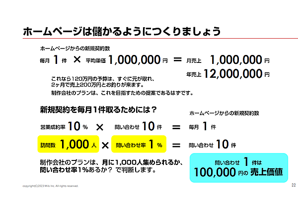 ホームページから新規契約できたときの売上を考えてみよう。たとえば、ホームページから平均単価100万円の契約が月1件取れたら、年間売上は1,200万円になる。サイト制作費が120万円であれば、2ヶ月で売上200万円となり、すぐに元が取れてお釣りがくる。新規契約を毎月1件取るための営業成約率が10%としたら、問い合わせは10件必要となる。問い合わせ率1%とすれば、訪問数1,000人という数字が出てくる。制作会社から提案されたプランは、月に1,000人集められるか、問い合わせ率は1%あるかで判断していくのがよい。