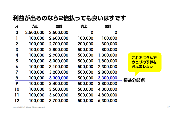 250万円で制作し、月10万円の保守費を支払う場合、年間累計370万円のコストが掛かる。しかし、見るべきは売上だ。当初の計画では毎月1件の契約で100万円の売上のはずが、2ヶ月に1件の契約獲得となり、月あたり50万円の売上が続くとする。その場合、8ヶ月目で支出と売上の累計が同額となり、損益分岐点となる。「損益分岐点がどこになるかを睨んで、ウェブの予算を考えましょう」と石井氏。