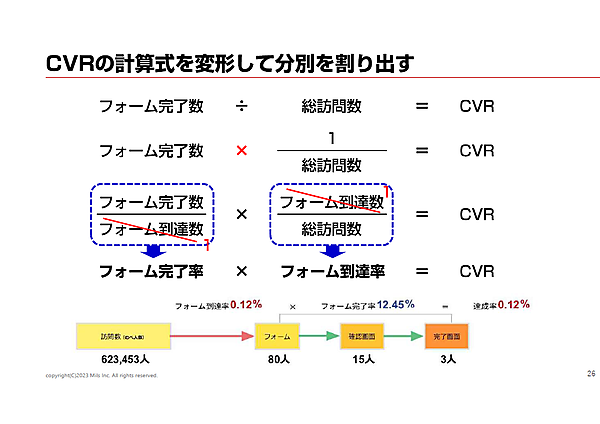 図のようにCVRの計算式「フォーム完了率÷総訪問数」を変形し、「フォーム完了率×フォーム到達率」でCVRが導きだせる。この計算式を使って、フォームに到達する前と後を分別し、どちらが原因でCVRが低くなっているのか調べ、数字の悪い方を改善しよう。