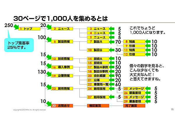 石井氏は「これは制作会社を詰めるためのものではないですよ。提案内容について、お互いにどんなことを考えていたのかを確認する土壌をつくりましょう」と語った。30ページで1,000人を集めることを想定し、各ページの集客数を積算したのが次の図だ。これを実際と比較し、集客できていないページの手直し・調整を行うことができる。