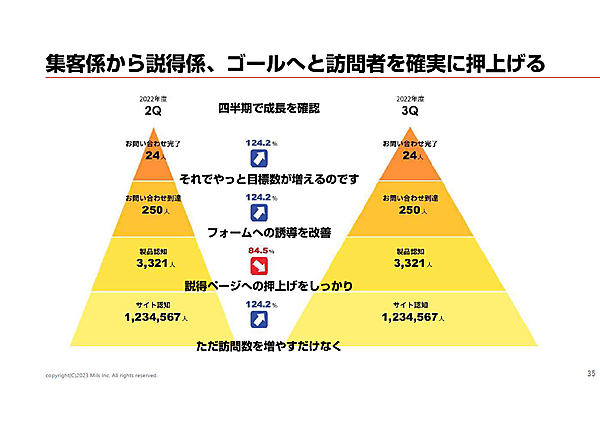 訪問者をサイト認知から製品認知、お問い合わせ到達、お問い合わせ完了へと押し上げるのがマーケティングの仕事だ。このフェーズごとの数値を、四半期ごとに取ることを石井氏はすすめる(月次では季節変動などで数字のブレがあるため)。四半期であれば、その変化を「確からしく」確認することができるという。