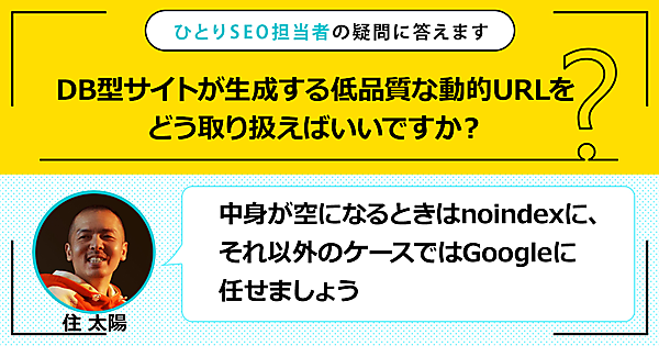 ひとりで頑張るSEO担当者さんの悩みに答える本連載。今回の質問は「DB(データベース)型サイトが生成する低品質な動的URLをどう取り扱えばいいですか?」です。この回答は「中身が空になるときはnoindexに、それ以外のケースではGoogleに任せましょう」です。