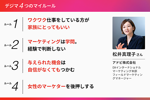 2児の母であり、アドビのマーケティングマネージャーの松井氏に、仕事やキャリアのマイルールを聞いた。