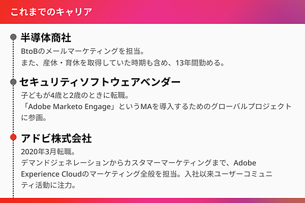 やがて、Adobe Marketo Engageのユーザー会への参加や登壇が、現在松井氏が所属しているアドビへの転職にもつながっていく。転職のきっかけは、ユーザーとしてユーザー会で活動してきた松井氏を長年見てきたアドビ社員からの勧めだった。「新体制になるアドビに来ていただくのは松井さんにとって非常に良い機会になると思う」と松井氏に声がかかったのだ。その誘いをどう思ったのだろうか。