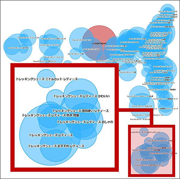 1つ1つの円がサジェストキーワード、円の大きさは検索数の大小を表現。また、検索意図が近いキーワードは近くに表示され、視覚的に検索意図のカタマリがわかるのがこの機能の特徴だ。