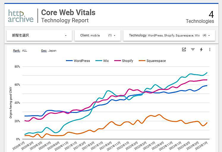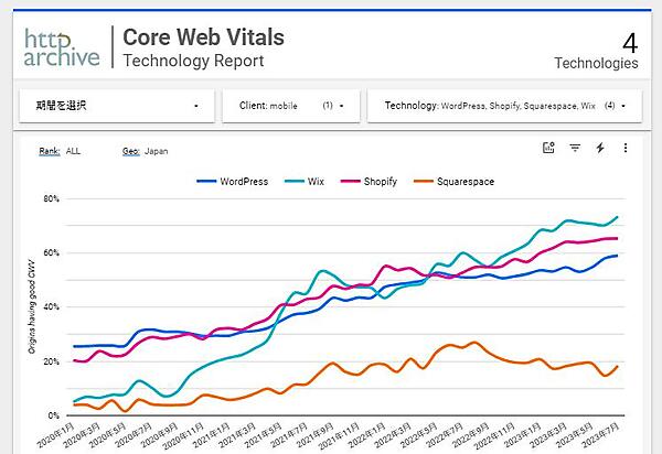 さらに、検索順位に影響を与えるとされるGoogleの指標「CWV(コアウェブバイタル)」のデータを見てみよう。他のサイト構築プラットフォームと比較すると、Wixは右肩上がりで、ユーザー体験が改善されている。2022年5月あたりから、WordPress.comやShopifyを抜いてトップの成績をキープしている。