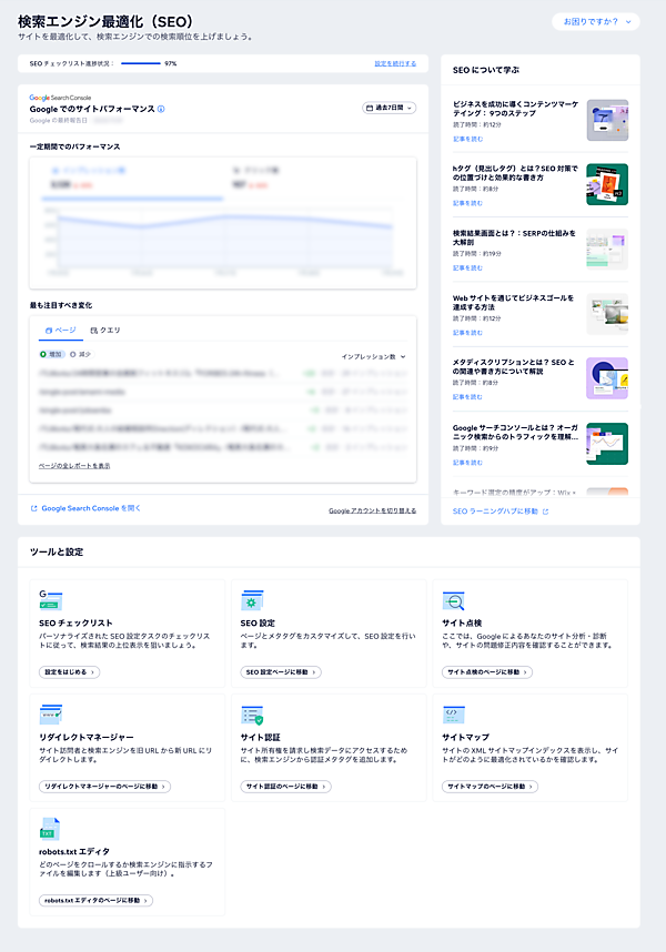 またSEOダッシュボードには、SEOについて学べる記事や動画といった教育コンテンツも用意されている。表示する内容はユーザーごとに異なり、Wix内でのユーザーのアクションや使用ツールなどから習熟度を判断して最適化されるという。