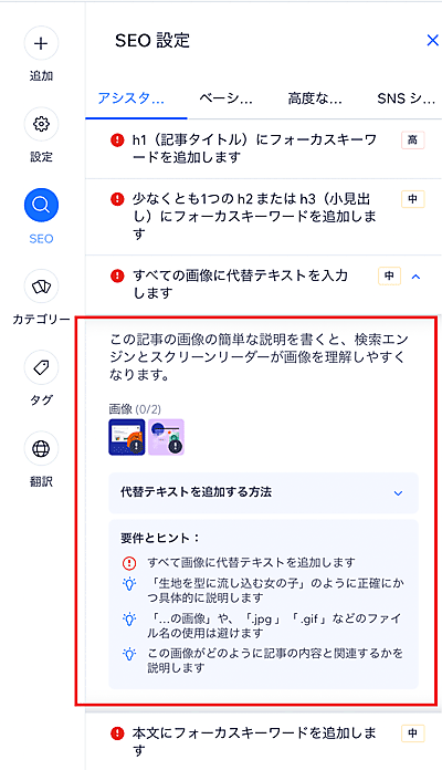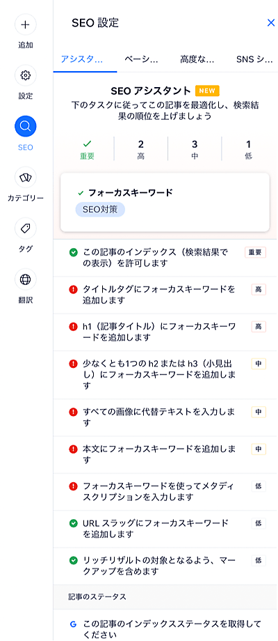 「SEOアシスタント」は、サイトの潜在的な問題を特定し、SEO最適化のための手助けをするもの。ブログのSEOアシスタントでは、フォーカスキーワードを設定すると、ユーザーがやるべきことを「重要」「高」「中」「低」と重要度別に通知してくれる。