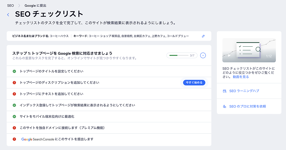 さらにWixのSEOチェックリストを使うことで、SEOに関わる設定が非常にスムーズに進みます。キーワードを設定するとナビゲーションが出てくるため、手順通りに設定していくだけです。これからWixを使ってみようという人にもおすすめしたい機能です。