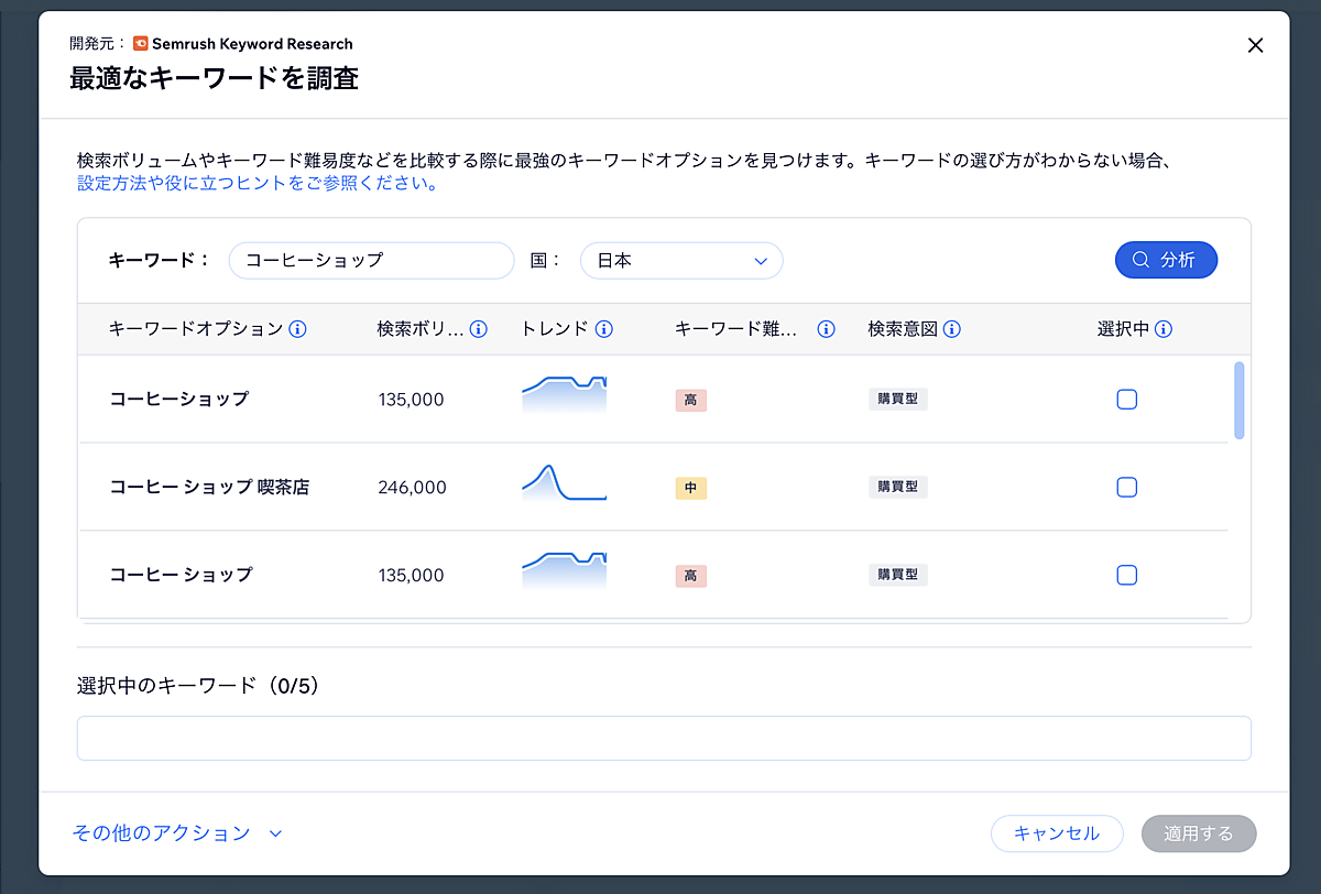 もし、どのようなキーワードを設定するか迷う場合は、Wixと連携しているキーワード分析ツール「Semrush(セムラッシュ)」を利用しよう。これは競合分析ツールで、通常は有料だが、Wixであれば24時間ごとに10キーワードまでが無料で分析できる。