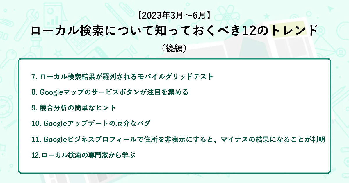この記事では、ローカル検索において2023年3月から6月までの3か月で変化した12のトピックを前編、後編にわけて解説している。
