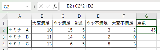 「大変満足」「やや満足」を2点、「普通」を1点、「やや不満足」「大変不満足」を0点にして、それぞれのセミナーごとに点数化しようとしています。