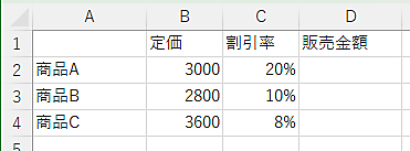 それでは、次の問題です。下の表は、商品ごとの定価と割引率をまとめたものです。販売金額のセル[D2]には、どのような式を入れますか?