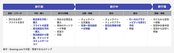 下図は筆者の旅行に行くときのユーザーシナリオを簡単に図示したものです。旅行のステップは複数に分かれていますが、このシナリオのなかの青字の部分をBooking.comで一元管理することが可能です。もしかしたら、これ以外の行動も管理できる機能があるかもしれませんが、筆者が把握しているなかで記載しています。ご了承ください。