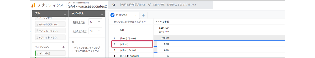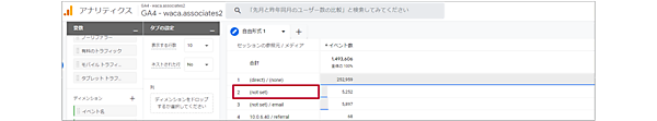 「session_start」 が発生していないセッションの「参照元 / メディア」は「(not set)」と表示されます。