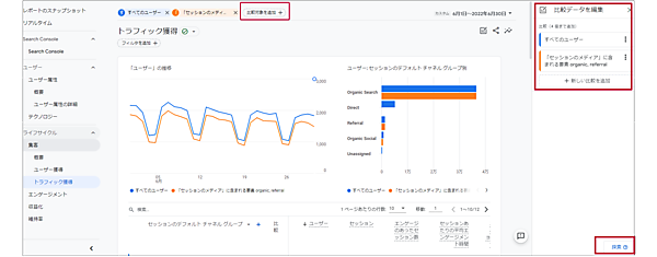 セグメントは、特定の商品を購入したユーザーや特定のページを訪れたユーザーなどを条件で抽出したグループを活用できる機能です。GA4ではこの機能は探索レポートのみで利用可能です。標準レポートでは直接のセグメント機能は提供されませんが、「比較」を用いることで、セグメントのような分析を行えます。「比較の対象を追加」ボタンを押し、比較の作成画面でディメンションと値を選ぶことで、特定の範囲での比較が可能です。