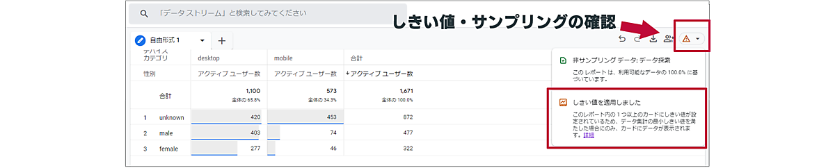 UAと比べて数値が少ないと感じることがあったら、データのしきい値が適用されていないか確認してみましょう。データのしきい値は、個別ユーザーの身元を推測できないようにするために設けられています。なおこれはGoogleによって定義されているので、調整はできません。