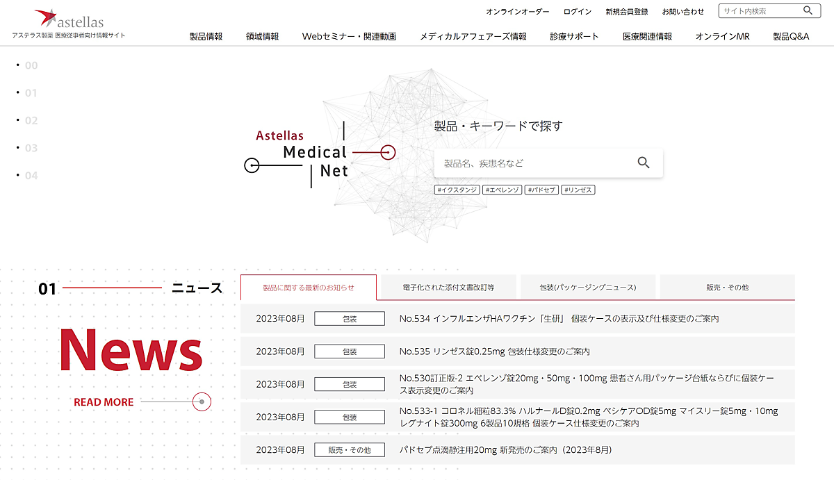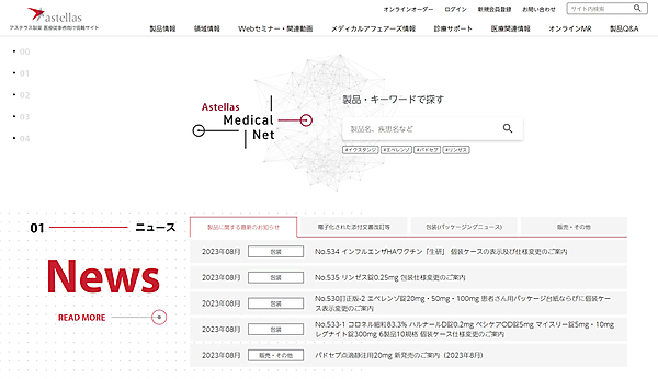 アステラス製薬の「Astellas Medical Net」とは、医師や薬剤師などの医療従事者しか見ることができない会員制の専門サイトで、次のようなコンテンツを配信・掲載している:
