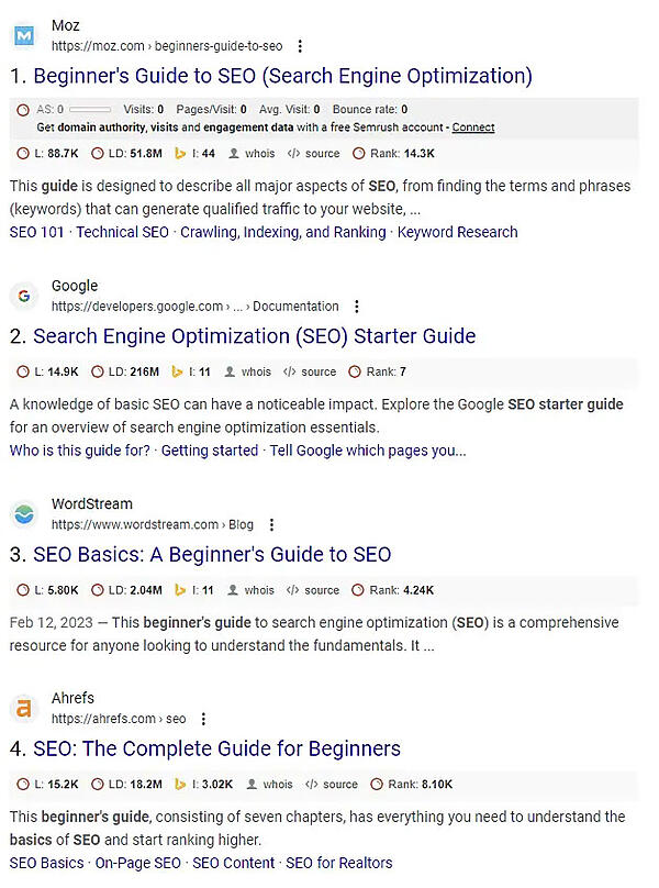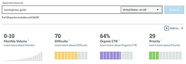 難易度の高いキーワードである「SEO beginner guide」(SEOビギナーズガイド)で検索した次の例を見てほしい。データはMozから取得したものだ。