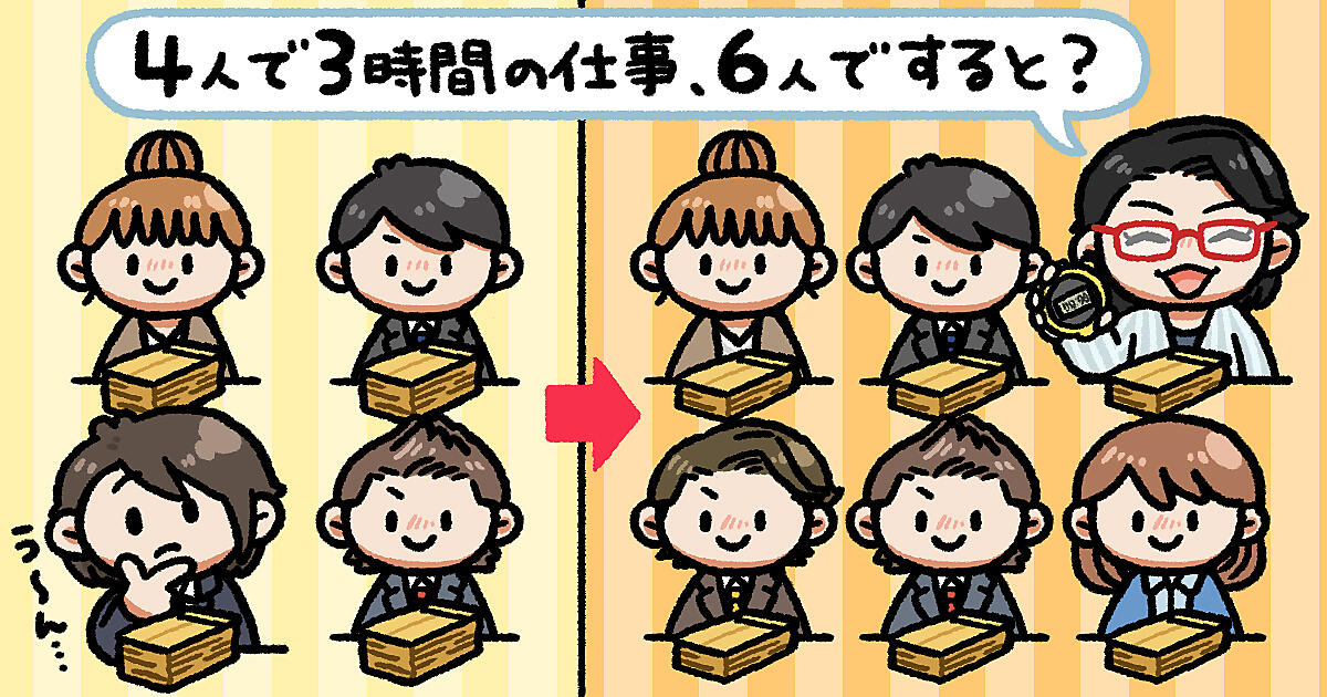 モリさん! 先輩から、作業時間の計算の宿題が出ました。4人で3時間だと、6人でやると2時間ってどういう計算ですか。