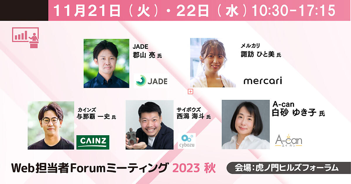 MIXI、日本マイクロソフト、タイガー魔法瓶、メルカリなどが登壇する「Web担当者Forumミーティング 2023 秋」を11月21日(火)~11月22日(水)の2日間、虎ノ門ヒルズフォーラムで開催します。今回は4年ぶりの完全リアル開催です!