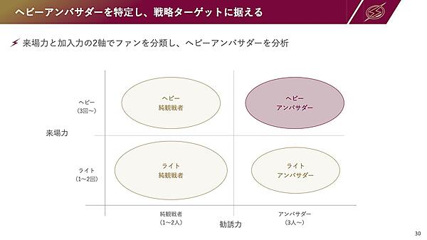 データを活用することで、根拠に基づいてターゲットや戦略を設計できるようになる(戦略の方向性)。たとえば、戦略ターゲットであるヘビーアンバサダーの特定では、より多く来場してくれる「来場力」と、周りの人を多く誘ってくれる「勧誘力」の2点を重視し、この2軸でデータを活用して探っていった。