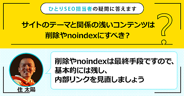 ひとりで頑張るSEO担当者さんの悩みに答える本連載。今回の質問は「サイトのテーマと関係の浅いコンテンツは削除やnoindexにすべき?」です。この回答は「削除やnoindexは最終手段ですので、基本的には残し、内部リンクを見直しましょう」です。
