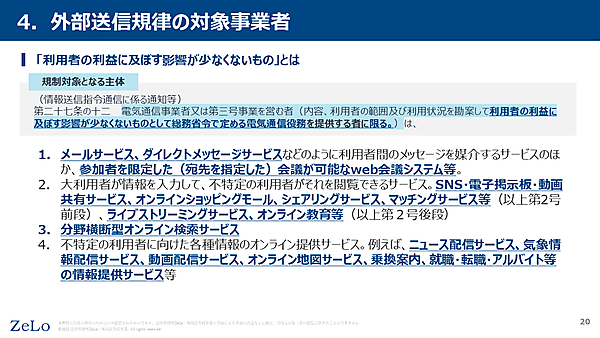 オンラインサービスを提供する事業者のうち、利用者の利益に及ぼす影響が少なくない事業者だけが今回の外部送信規律の対象だと法律は定めています。先程のフローチャートがすべてYesの場合でも、次の4つの類型に当てはまらなければ、外部送信規律の適用対象外となります(結城氏)