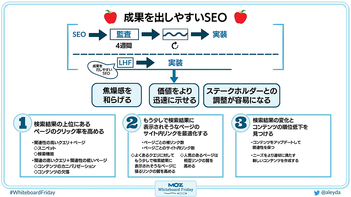 今回のホワイトボード・フライデーでは、通常のSEOプロセスと並行して「成果を出しやすい分析」を行う方法について、アレイダ・ソリス氏が解説する。