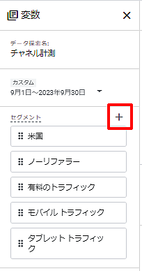- カスタムセグメントとは、データ探索ツールで任意の条件を指定することにより条件に一致したデータが取得できる機能。