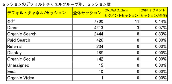 全体のアクセスのうち、「CV_WAC_Semi」セッションの内数を下記のように抽出できました。