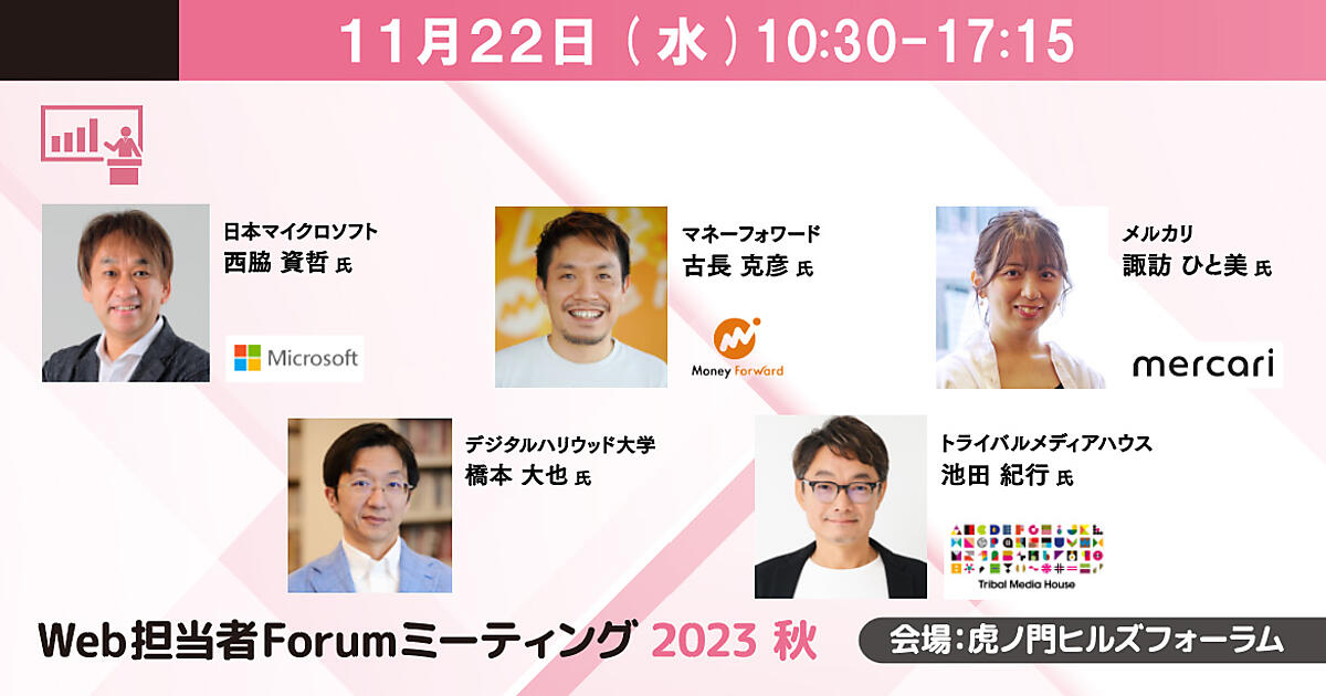 4年ぶりの完全リアル! 本日、日本マイクロソフト、デジタルハリウッド大学、マネーフォワード、トライバルメディアハウスなどが登壇する「Web担当者Forumミーティング 2023 秋」を開催中です! 今回は4年ぶりの完全リアル開催で、会場は虎ノ門ヒルズフォーラムです。