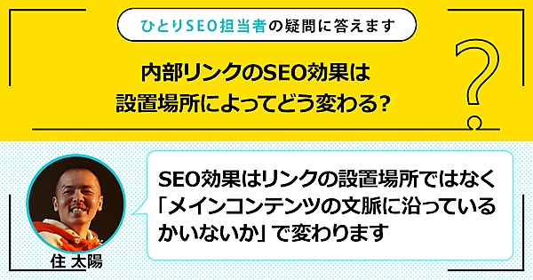ひとりで頑張るSEO担当者さんの悩みに答える本連載。今回の質問は「内部リンクのSEO効果は設置場所によってどう変わる?」です。この回答は「SEO効果はリンクの設置場所ではなく『メインコンテンツの文脈に沿っているかいないか』で変わります」です。