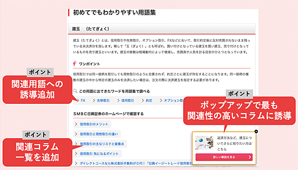 検索上位に来ている用語解説ページも多かったが、美根氏は「ユーザーが本質的に知りたいのは単に用語の意味だけではないのでは?」と考えたという。そこで、ポップアップ表示などでコラムへの誘導を追加して、回遊率を高めるような施策を実施した。